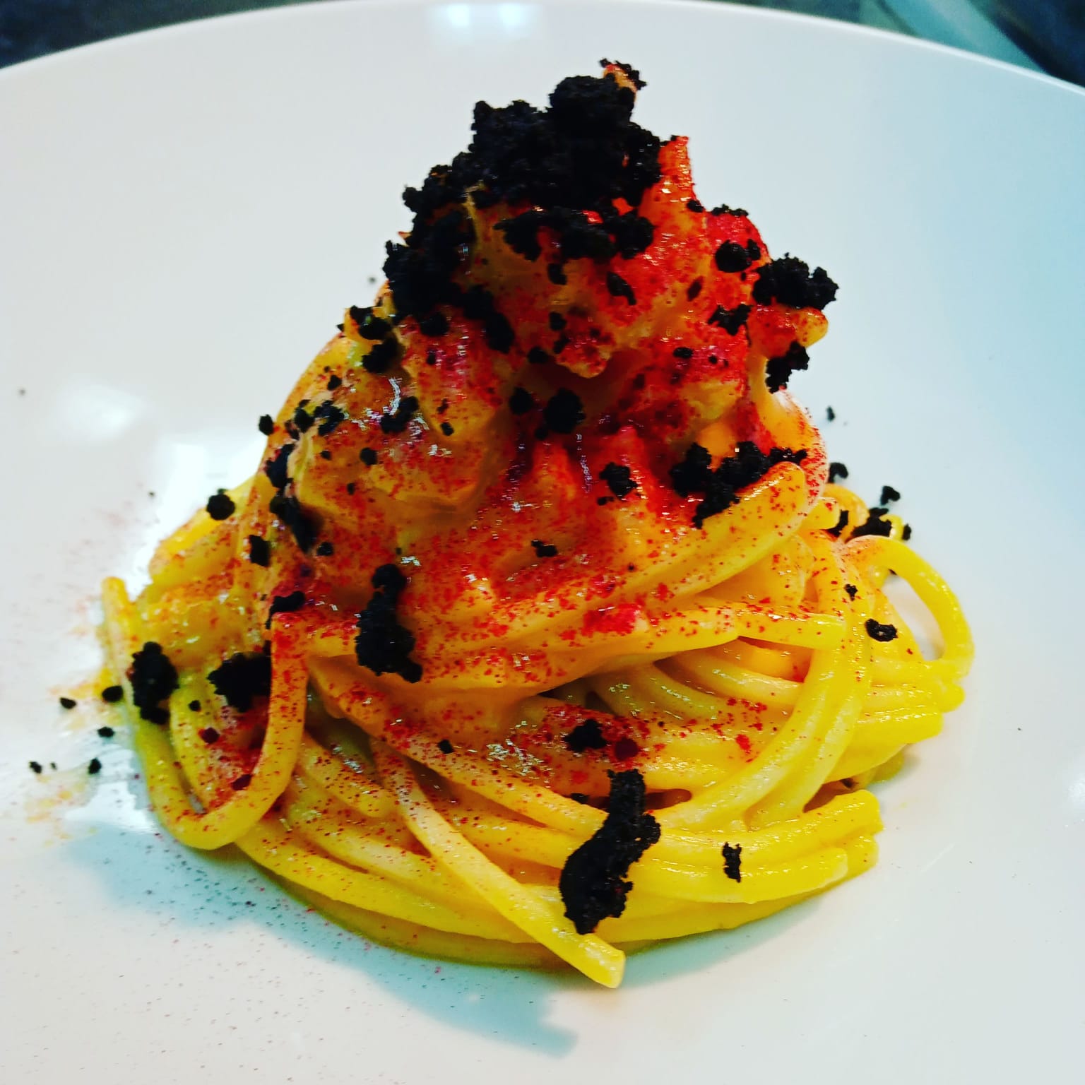 Spaghettone Pietro Massi con cicale di mare, ristretto di carote, polvere di barbabietola